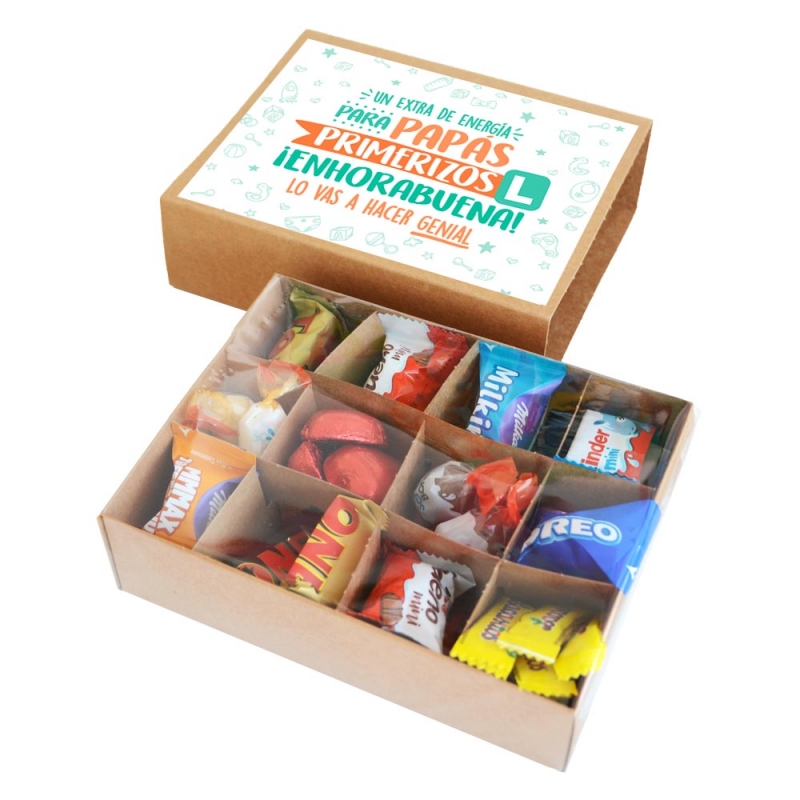 Normalmente cuando nace un bebé todos los regalos van dirigidos a la madre y al nuevo miembro de la familia, pero y ¿los padres primerizos? Ellos también hacen un duro trabajo en estos momentos, sorpréndele y dale la enhorabuena con esta cajita de chocolatinas tan deliciosa, será un subidón de azúcar para celebrar la buena nueva y coger energía para los primeros días ¡Estamos seguros que le encantará!